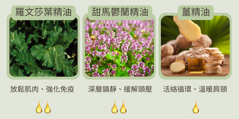 將以上精油滴入 10 毫升植物油(如甜杏仁油或葡萄籽油)中,調和均勻後塗抹於肩頸僵硬部位。建議搭配熱敷,能加速放鬆效果。