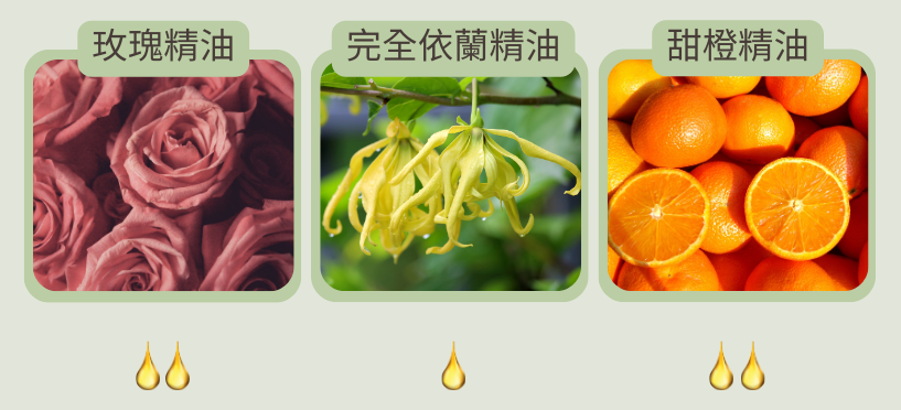 玫瑰( 2滴)+ 完全依蘭 ( 1滴)+甜橙( 2滴)