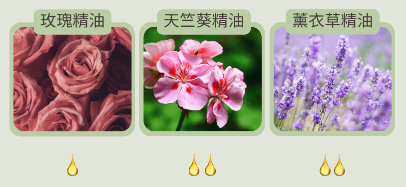 玫瑰( 1滴)+ 天竺葵 ( 2滴)+薰衣草( 2滴)
